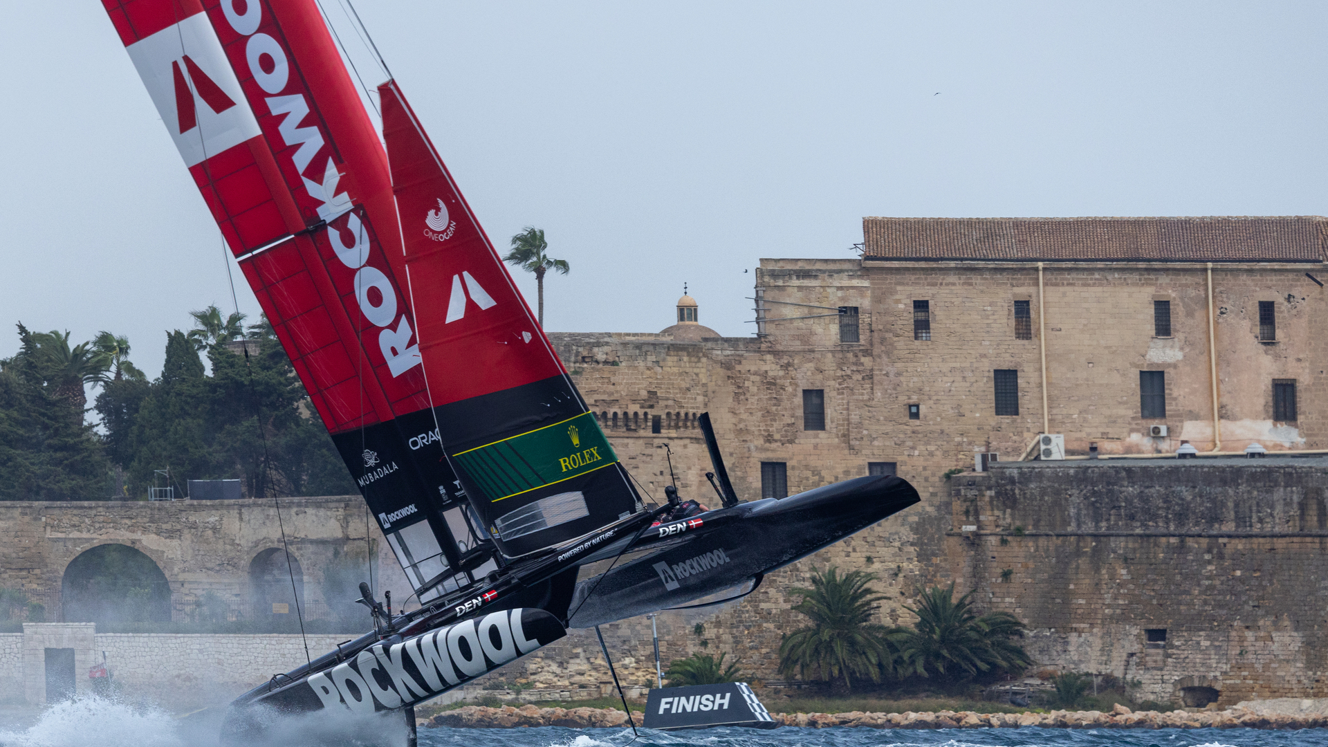 Denmark SailGP team balancing F50 while catching upwind (truewind from ahead)
